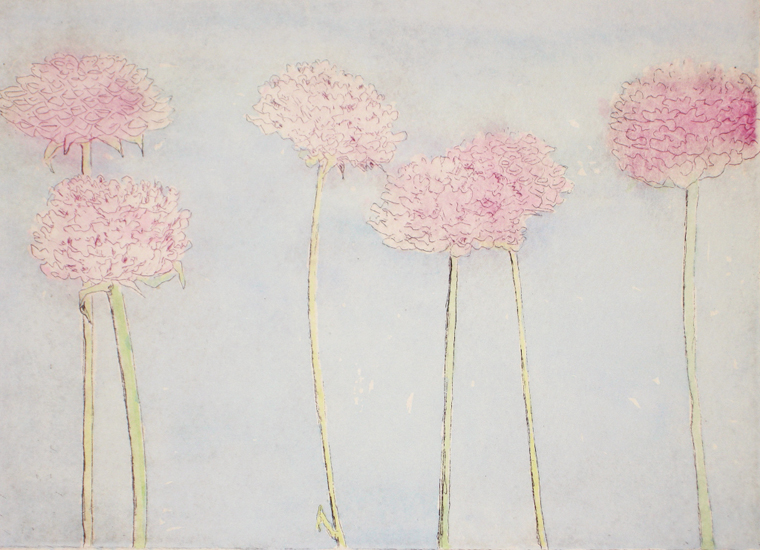 Metis Beach Dahlias, etching with watercolour v/e 3/10, 18 x 23 cm., 2012 | Return to Prints Menu | Return to Artwork Menu. |