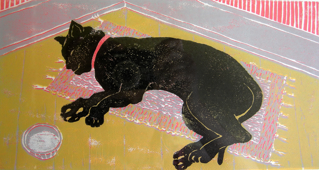 Cat on Mat, reduction linocut, 21 x 31 cm, v/e 5/10, sold. | Return to Prints Menu | Return to Artwork Menu. |
