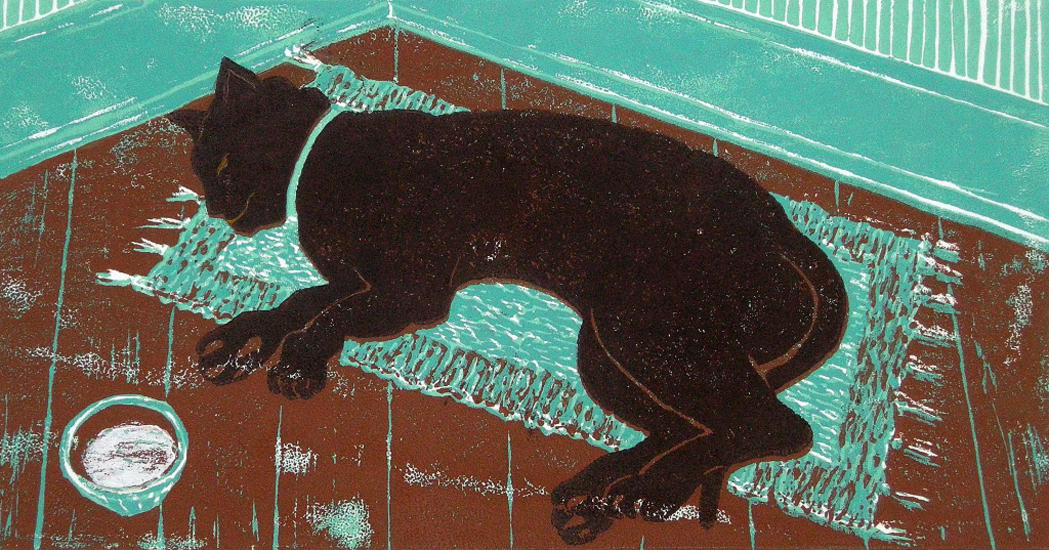 Cat on Mat, reduction linocut, 21 x 31 cm, v/e 2/10, 2005, sold. | Return to Prints Menu | Return to Artwork Menu. |